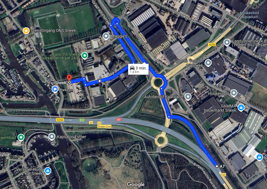 - Komende op de A7 vanuit Joure neem in Sneek afrit 22 Sneek Oost