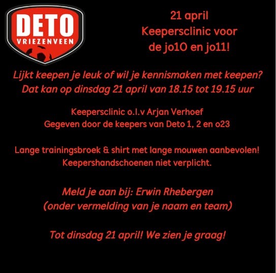 Aanstaande dinsdag staat dé keeperstrainer van DETO 1, Arjan Verhoef, samen met zijn keepers klaar om een super gave keeperstraining te verzorgen voor de spelers van O10 en O11.